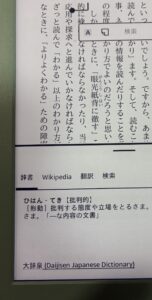 また、読書中には、本文に出てくる知らない単語を指で押すだけで、すぐに意味を確認することができる「辞書機能」があります。(多くの活字の本で辞書機能を使うことができます)